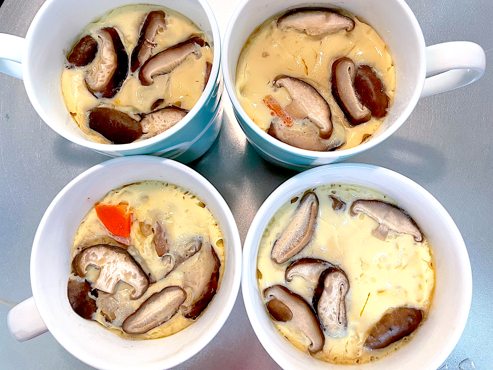 寒くなると食べたくなる、茶碗蒸し。お鍋に湯をはり、マグカップに具材を入れて蒸します。お鍋にふたをして中火で15~20分位。ちょっと蒸しすぎてしまいましたが、とてもおいしいです。人参やほたてを入れてもおいしいです。